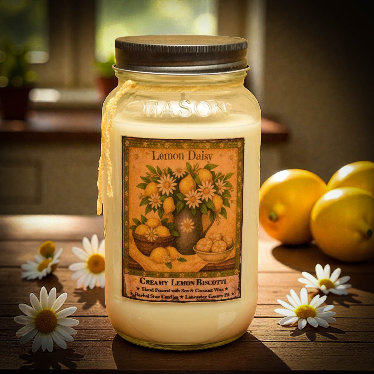 Lemon Daisy is the name of the scent of this candle. The scent is freshly baked lemon biscotti…NOT pledgy lemon, but baked lemon cookies. Now poured into our popular line of Mason Jars with Soy & Coconut Wax, they will burn for 110 hours!
