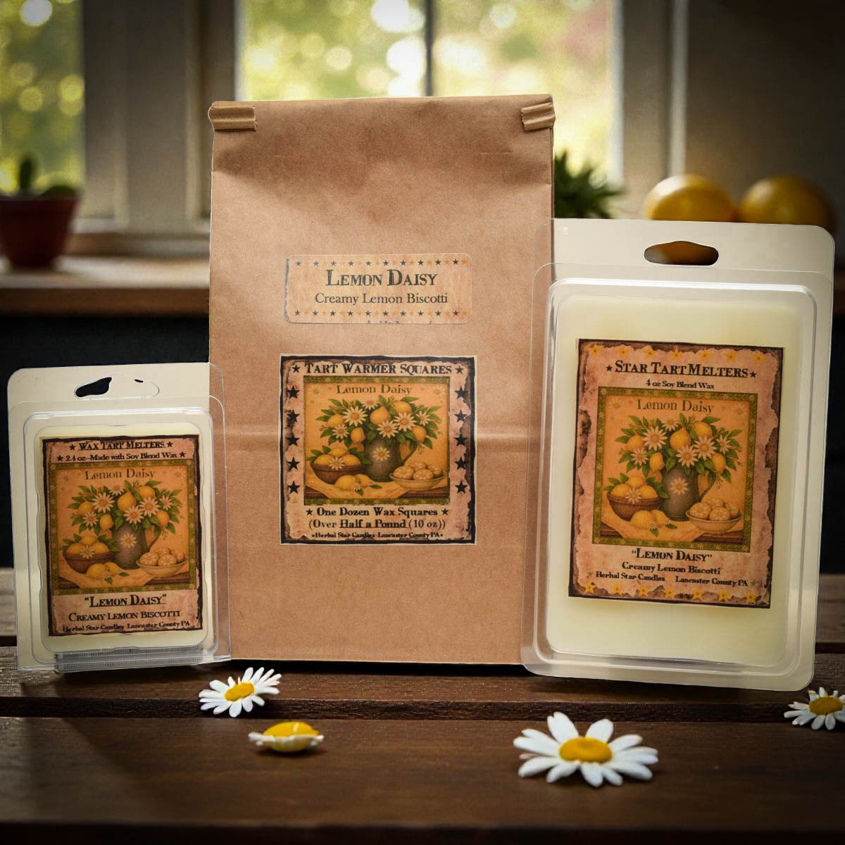 A creamy lemon biscotti bakery scent in a 2.4 oz mini pack of flameless wax tarts. Lemon Daisy mini tarts are perfect for tart warmers and gift giving.