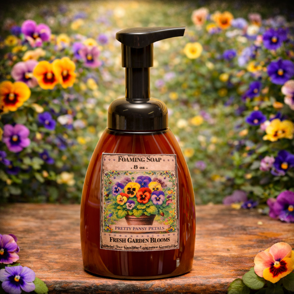 Pretty Pansy Petals foaming soap is perfect for guest bathrooms, powder rooms, and everyday use at the sink. It pairs beautifully with farmhouse, cottage, and vintage-inspired spaces, making it as pretty as it is practical.