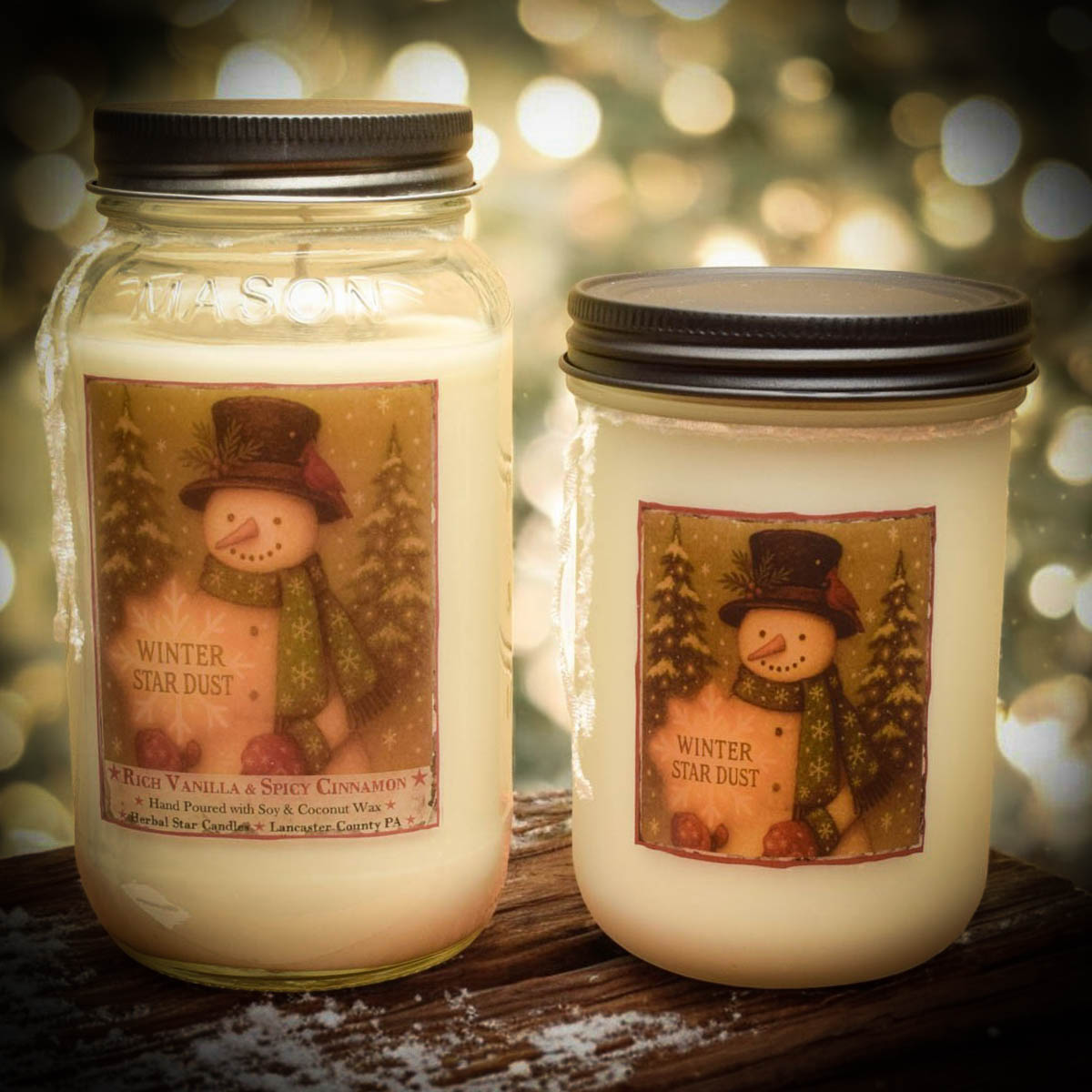 Limited Winter Star Dust Frosted White Farmhouse Jar candle—an 18 oz hand-poured blend of rich vanilla and spicy cinnamon in a frosted white jar. Burns up to 100 hours and fills your home with cozy winter warmth.